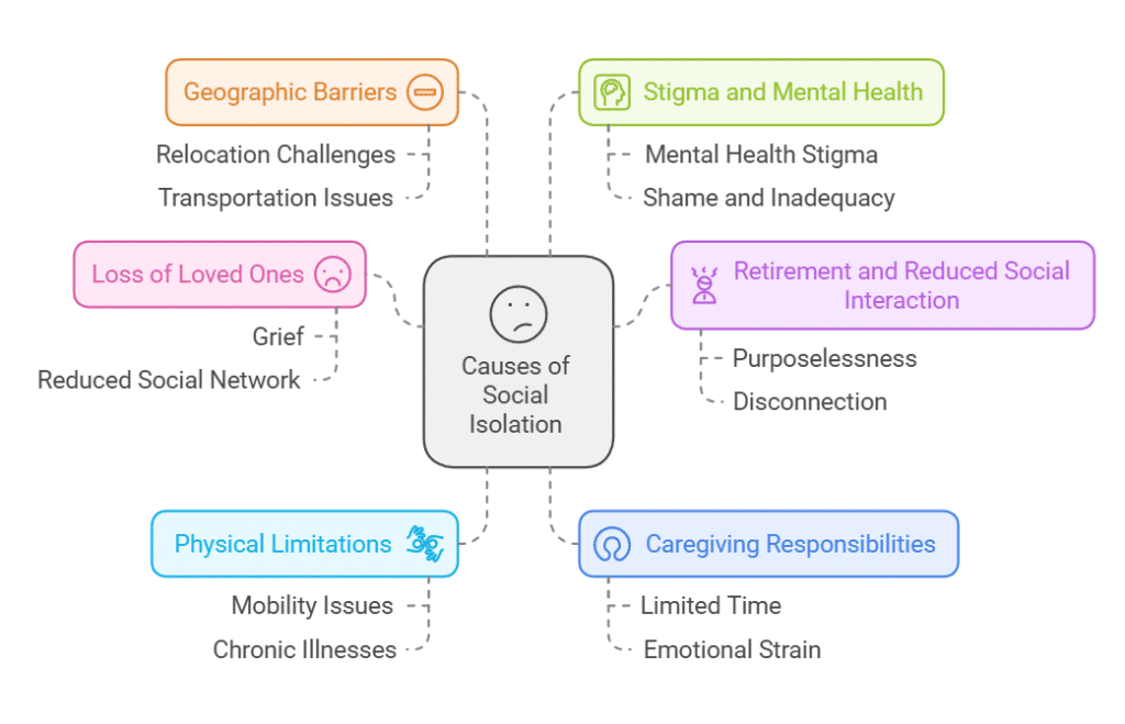 - Mobility issues, chronic illnesses, or disabilities can restrict older adults’ ability to leave their homes, participate in activities, or visit friends and family.